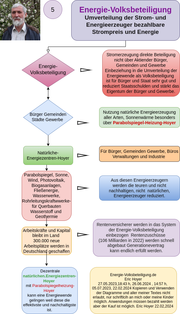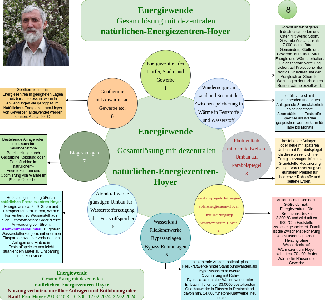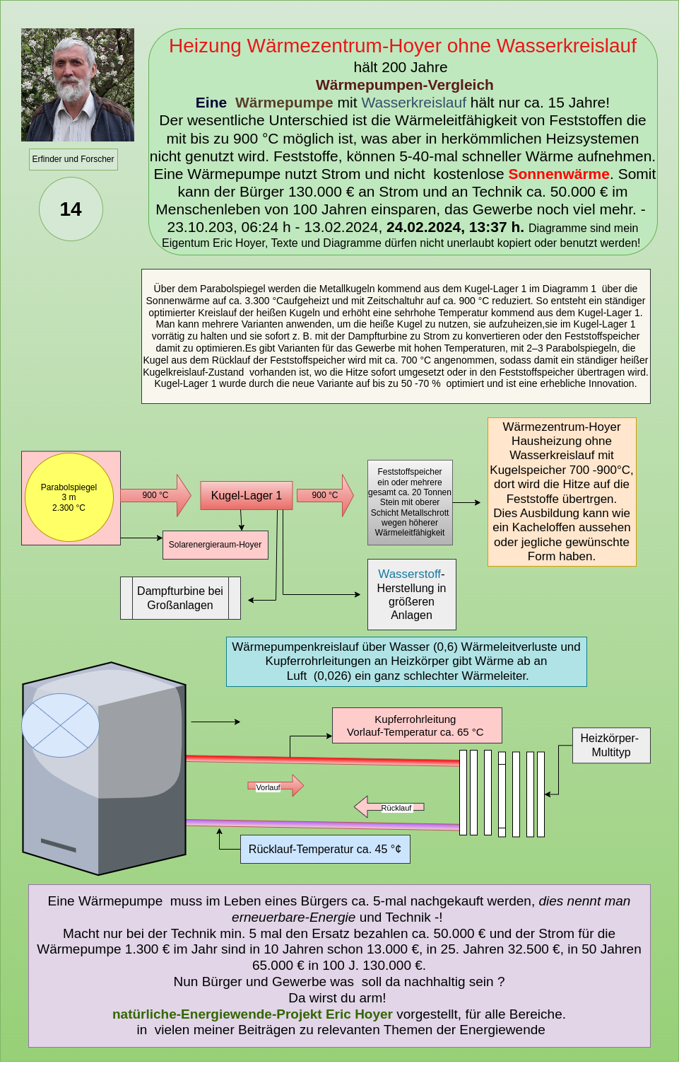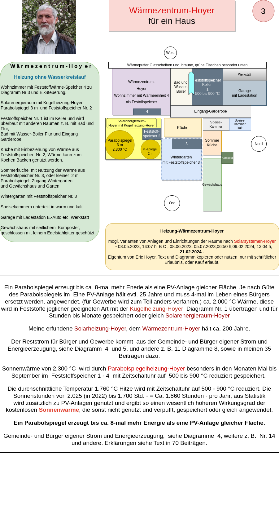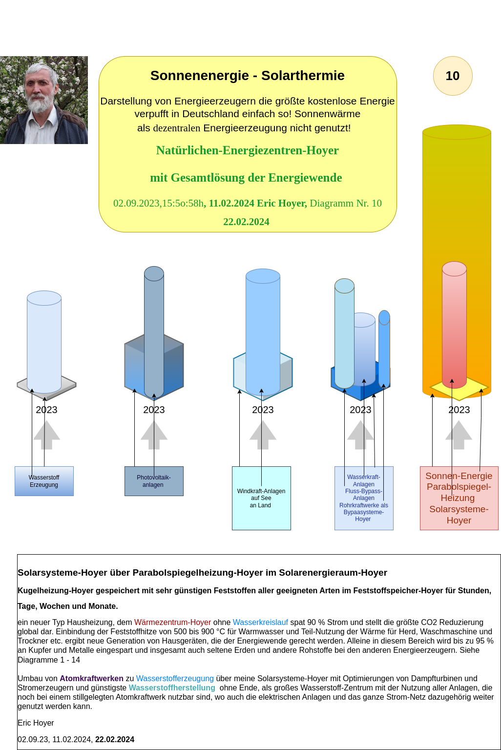 My inventions, processes, and applications – such as the Natural Energy Centers-Hoyer, the Heating-Warming Center-Hoyer, the Sphere Heating-Hoyer, and the Solid Storage-Hoyer – have proven through calculations that electricity, heat, energy, and hydrogen can be generated much more cost-effectively and environmentally friendly using solar heat and the Solar Systems-Hoyer. These systems have the potential to meet the climate goals set for 2045, as they enable a secure base load energy supply through decentralized solutions for communities, cities, businesses, and industries.